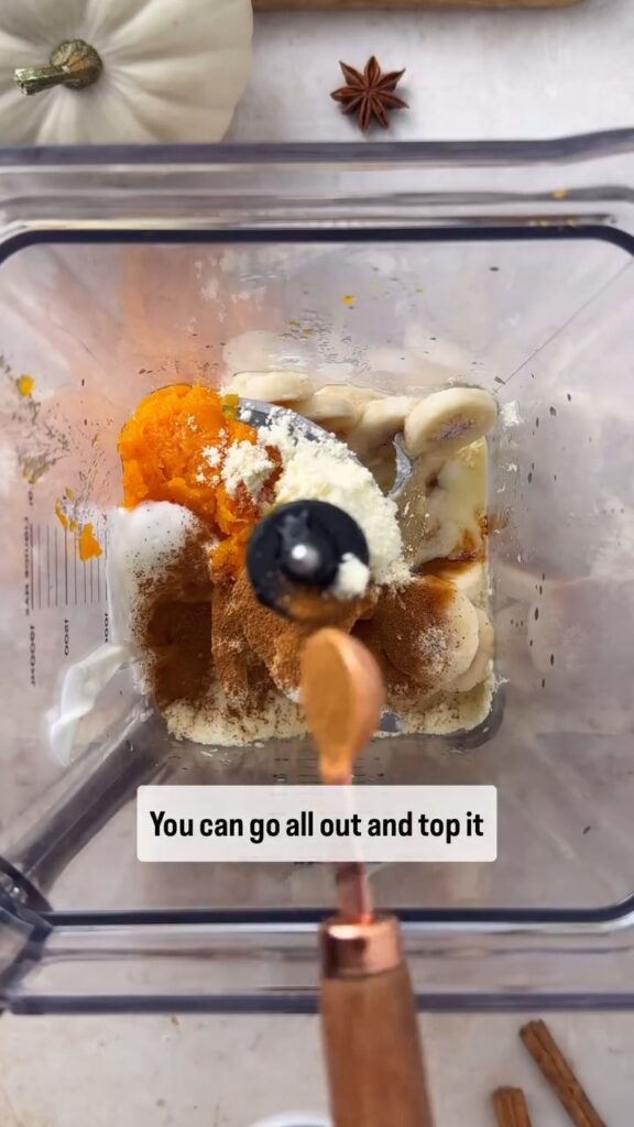 1. Toss everything into a blender. Yep, it’s that simple. Pumpkin, banana, almond milk, spices, vanilla, and ice all go in.